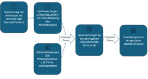 Zunächst müssen in allen relevanten Zeiterfassungsprofilen Zeitbewertungen („Time Valuations“) hinterlegt werden, die die erste Zeiterfassung am jeweiligen Tag identifizieren. Hierbei ist sicherzustellen, dass es sich tatsächlich um den Arbeitsbeginn des Tages handelt – beispielsweise dürfen Ausstempelungen für Raucherpausen nicht die ursprünglich erfasste erste Uhrzeit überschreiben. Im Anschluss wird diese Information mit Hilfe einer Integration (via „Integration Center“) in ein kundeneigenes Objekt geschrieben. Je nach Anforderungsausprägung können in dem Zuge weitere Kriterien wie beispielsweise Standort oder juristische Einheit aus den Mitarbeiterinformationen mit in das Objekt übernommen werden. Da die zur Identifizierung der jeweiligen Schicht notwendigen Informationen nun konsolidiert in einem Objekteintrag je Mitarbeitenden vorliegen, können mithilfe einer Geschäftsregel verschiedenste Wenn-Dann-Prüfungen erfolgen, um die jeweils korrekte Schicht aus den Parametern abzuleiten. Im letzten Schritt wird durch eine weitere Integration die identifizierte Schicht in den temporären Arbeitszeitplan geschrieben.
