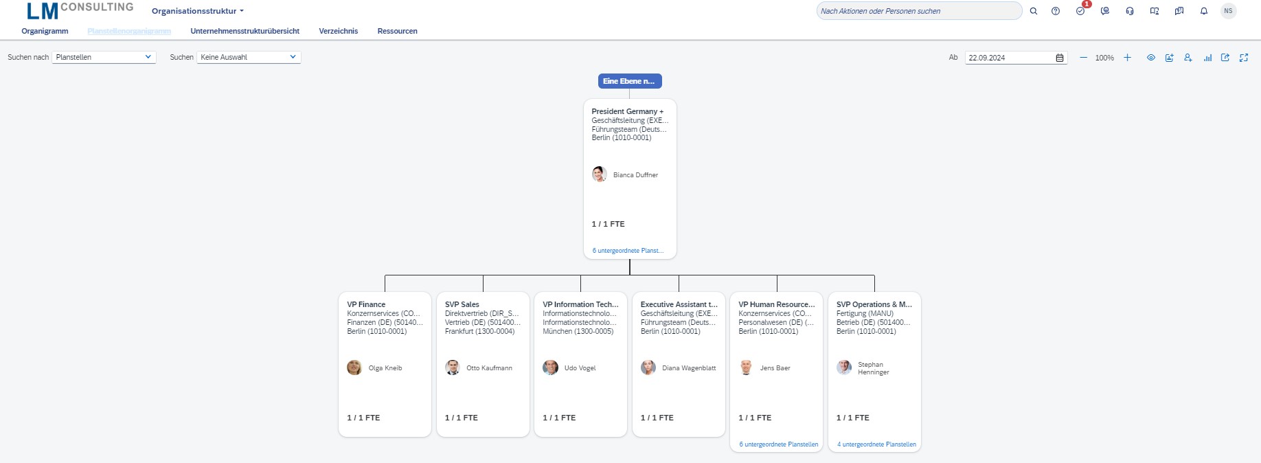 - Visualisierung der Strukturen im Firmen-, Personen- oder Planstellenorganigramm